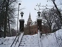 The 50-acre (20 ha) main campus is located at the highest point in New Ulm, between Hermann Heights Monument and Flandrau State Park.[4] Most of MLC's academic and administrative operations are located within the college's Old Main, dedicated in 1884, the Wittenberg Collegiate Center, dedicated in 1928, and the Link, connecting Old Main to the Wittenberg Collegiate Center, dedicated in 1995.[81][82] The Old Main was added to the National Register of Historic Places in 1979, after being nominated as a leading example of Gothic Revival architecture in Minnesota and a distinctive symbol of local religious education.[83] The main campus also includes the Luther Student Center, Music Hall, Music Center, the 1200-seat Chapel of the Christ, a 900-seat auditorium (within the Wittenberg Collegiate Center), a gymnasium, a library, four residence halls, and several faculty homes.[4] The college's library cooperates with the Traverse des Sioux Library System.[84]