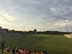 The stadium features seating for 4,000, including the general admission lawn, with corresponding restroom facilities, formal press box, and box office.[7] The grass playing field measures 115 x 75 yards.