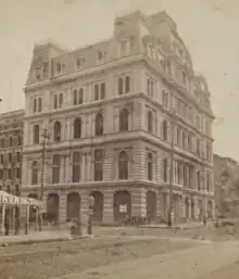Due to infighting in the Grand Lodge, the Panic of 1857, and the American Civil War, it would not be until the mid-1870s that the Grand Lodge would again have a permanent meeting location. On June 8, 1870,[8] the cornerstone was laid for a new Second French Empire Style building which served as the headquarters of the Grand Lodge from 1875 to 1909. This building was designed by Napoleon LeBrun and due to the Panic of 1873 would take four years to complete, at the staggering cost of $1.279 million dollars.[9] Construction was completed in late 1874, with the formal dedicated on June 2, 1875.[10][11]