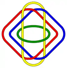 The complement of the Borromean rings[1] gives an example where the triple Massey product is defined and non-zero. Note the cohomology of the complement can be computed using Alexander duality. If u, v, and w are 1-cochains dual to the 3 rings, then the product of any two is a multiple of the corresponding linking number and is therefore zero, while the Massey product of all three elements is non-zero, showing that the Borromean rings are linked. The algebra reflects the geometry: the rings are pairwise unlinked, corresponding to the pairwise (2-fold) products vanishing, but are overall linked, corresponding to the 3-fold product not vanishing.