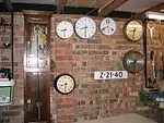 Master clock (at left) driving several slave clocks in an enthusiast's garage. The third one from the left at the top is a radio-controlled clock for reference.