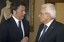 After the rejection of his constitutional reform in the 2016 Italian constitutional referendum,[11][12] Renzi formally resigned as Prime Minister on 12 December; his Foreign Minister Paolo Gentiloni was appointed his replacement.[13][14] He resigned as secretary of the PD following defeat in the 2018 Italian general election.[15] In September 2019, he left the PD and founded the Italia Viva party.[16] In January 2021, Renzi revoked his party's support to the Conte II Cabinet headed by Prime Minister Giuseppe Conte, which brought down the government and resulted in the 2021 Italian government crisis.[17] In February 2021, Renzi's IV supported Prime Minister Mario Draghi's national unity government.[18] Renzi has been described as a centrist and as a liberal by political observers.[19][20][21]
