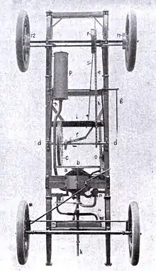 Wenkel's first car, built around 1899, was based on a light tubular steel frame for an air-cooled De-Dion-Bouton engine, originally developed for tricycles. The rear axle was chain-driven. The next model, a four-seater with a break chassis and a stronger water-cooled Aster motor with battery ignition, he was already calling a "Wenkelmobil". With an improved 4-hp version with a Belgian Vivinus engine he travelled through the Far East from 1901 to 1903 and built Wenkelmobils adapted to the tropical climate in Java, where petrol was very cheap.[11] The construction followed that of light American steam cars, with a standing engine in the rear and friction drive.[12] After his return to Berlin Schneider & Co produced several models of the Wenkelmobil, which was at first a reasonably successful small car. The construction of the car was described in a contemporary automobile magazine with reference to the picture alongside:[13]