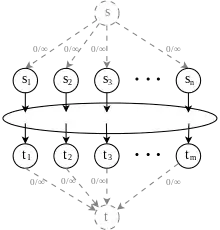 Given a network with a set of sources and a set of sinks instead of only one source and one sink, we are to find the maximum flow across . We can transform the multi-source multi-sink problem into a maximum flow problem by adding a consolidated source connecting to each vertex in and a consolidated sink connected by each vertex in (also known as supersource and supersink) with infinite capacity on each edge (See Fig. 4.1.1.).