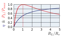 The efficiency η is the ratio of the power dissipated by the load resistance RL to the total power dissipated by the circuit (which includes the voltage source's resistance of RS as well as RL):