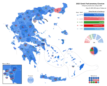 Snap parliamentary elections were held in Greece on 21 May 2023.[1][2][3] All 300 seats in the Hellenic Parliament were contested. They were the first elections since 1990 not to be held under a bonus seats system, due to amendments to the electoral law made in 2016. Instead, a purely proportional system was used.[4]