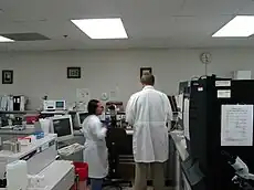 Clinical laboratory in a hospital setting with two technologists shown.