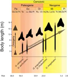 44. 1 2 3 4 Perez, Victor; Leder, Ronny; Badaut, Teddy (2021). "Body length estimation of Neogene macrophagous lamniform sharks (Carcharodon and Otodus) derived from associated fossil dentitions". Palaeontologia Electronica. 24 (1): 1–28. doi:10.26879/1140.