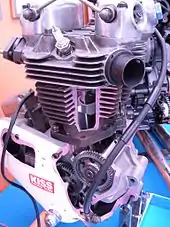 In 1960, by which time it was Japan's longest running motorcycle company out of the hundreds that had once flourished producing copies of European models, the company became affiliated with the Kawasaki Aircraft company. It first changed its name in 1962 to Kawasaki-Meguro, which produced the successful B8 125 cc;[7] then in October 1964, seeing the commercial and marketing value of having a motorcycle producing division alongside its heavy industry services and particularly its already established sales outlets,[8] Kawasaki took full control of the company[9] having learnt all it needed to know.[7] Together they started produced "Kawasaki-Meguro Works" 125 cc, 175 cc and 250 cc single cylinder vehicles. The 500 cc K-series twin cylinder model was later enlarged and developed into the 625 cc Kawasaki W series. The latter model were used as official vehicles for government purposes.[10]