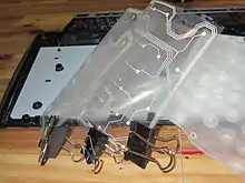 Internal layers of a modern full-travel computer keyboard; bottom contact layer, spacer layer with holes, top contact layer, then elastomer top layer to provide restoring force to keytops.