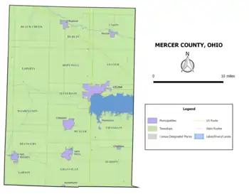 Mercer County is located in the U.S. state of Ohio. As of the 2020 census, the population was 42,528.[1] Its county seat is Celina.[2] The county was created in 1820 and later organized in 1824.[3] It is named for Hugh Mercer, an officer in the American Revolutionary War.[4]