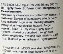 Mercury oxide is a highly toxic substance which can be absorbed into the body by inhalation of its aerosol, through the skin and by ingestion. The substance is irritating to the eyes, the skin and the respiratory tract and may have effects on the kidneys, resulting in kidney impairment. In the food chain important to humans, bioaccumulation takes place, specifically in aquatic organisms. The substance is banned as a pesticide in the EU.[11]