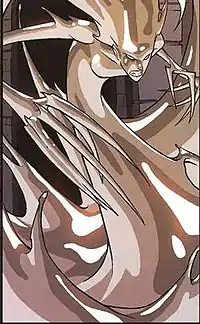 The body of Mercury is composed of a non-toxic metal resembling mercury.[10] She can reshape or solidify it at will.[11] Her molecular adhesion power grants her the ability to cling to solid surfaces and move her body at will. She has demonstrated superhuman strength by supporting huge slabs of concrete. She also possesses superhuman durability owing to her mercury form. Mercury does not require food or drink due to her composition. She is one of the few people who can touch Wither as her body is not organic. Her inorganic body also made her immune to the pheromone based powers of Wallflower and was placed as her roommate. She can also control pieces of her liquid mercury and has the potential to bring it back to her. It usually forcefully separated from her body, her liquid mercury turns into dead flesh, as demonstrated during the Facility's experiments. Some of her mercury has been separated as living mercury tissue and was used for Predator X's skin. She is currently less than her original mass, as she states that when Laura cut off her hands to save her during the fight with Nimrod, she "lost a few pounds." Additionally, she has some resistance to magic due to her transient form.[4][12]