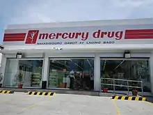 The Mercury Drug Corporation, better known as Mercury Drug, is a Filipino pharmacy chain. A subsidiary of the Mercury Group of Companies, it is headquartered in Bagumbayan, Quezon City.[5] The chain was founded in Santa Cruz, Manila in 1945,[1] making it the second oldest drugstore chain in the Philippines after Southstar Drug by eight years. As of 2017, Mercury Drug has over 1,000 branches nationwide[6] and over 50 percent of the Philippine pharmaceutical retail market.[7]