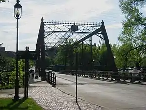 Merriam Street Bridge is a truss bridge that spans the east channel of the Mississippi River between Nicollet Island and the east bank of the river in Minneapolis, Minnesota. The bridge was originally built in 1887 by King Iron Bridge Company as one of the four spans of the Broadway Avenue Bridge. When the Broadway Avenue Bridge was reconstructed in 1987, one span was preserved and moved to Nicollet Island. The truss span is actually decorative; the bridge is supported by a beam from underneath.