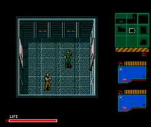 The transceiver has also been greatly revamped from the first game as well, with conversations now being context-sensitive rather than being simply area-oriented. The transceiver screen now displays the faces of Snake and the radio contact he's currently communicating with. The player can also talk to children living in the fortress to gain new information; the player is penalized with a loss of health if he kills a child. The areas are more varied than in the previous MSX2 game and a number of puzzles must be fulfilled to complete the game, such as luring a carrier pigeon with a specific kind of ration, chasing after a female spy to the ladies' lavatory, and deciphering secret tap codes to gain new frequency numbers.[7]