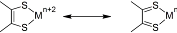 Due to their delocalized electronic structure, 1,2-dithiolene complexes undergo reversible redox reaction. When oxidized, dithiolene complexes have greater 1,2-dithioketone character. In reduced complexes, the ligand assumes more ene-1,2-dithiolate character. These descriptions are evaluated by examination of differences in C-C and C-S bond distances. The true structure lies somewhere between these resonance structures. Reflecting the impossibility to provide an unequivocal description of the structure, McCleverty introduced the term 'dithiolene' to give a general name for the ligand that does not specify a particular oxidation state. This suggestion was generally accepted, and 'dithiolene' is now a universally accepted term. Only more recently the radical nature of monoanionic 1,2-dithiolene ligands has been pointed out.[7] While few examples of authentic dithiolene radicals have been reported, diamagnetism in neutral bis(1,2-dithiolene) complexes of divalent transition metal ions should be considered as a consequence of a string antiferromagnetic coupling between the two radical ligands.