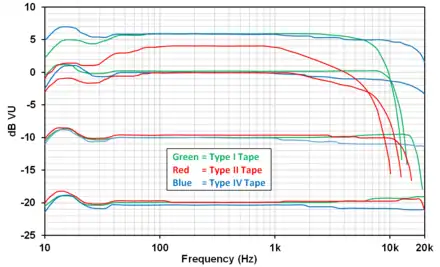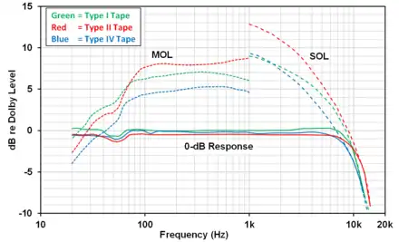 During the many years that cassette decks were popular, many audio magazines published comparative measurements of the performance characteristics of the wide variety of different tapes that were available in the marketplace.[88][89][90][91][92][93] [94] These measurements typically included parameters such as MOL, SOL, frequency response at 0-dB and −20-dB re Dolby Level, signal-to-noise ratio, modulation noise, bias level, and sensitivity. The first figure shows frequency response plots for sample Type I, Type II, and Type IV cassette tapes comparing their MOL, SOL, and 0-dB performance.