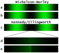 Using a special optical arrangement involving a 1/20 wave step in one mirror, Roy J. Kennedy (1926) and K.K. Illingworth (1927) (Fig. 8) converted the task of detecting fringe shifts from the relatively insensitive one of estimating their lateral displacements to the considerably more sensitive task of adjusting the light intensity on both sides of a sharp boundary for equal luminance.[16][17] If they observed unequal illumination on either side of the step, such as in Fig. 8e, they would add or remove calibrated weights from the interferometer until both sides of the step were once again evenly illuminated, as in Fig. 8d. The number of weights added or removed provided a measure of the fringe shift. Different observers could detect changes as little as 1/1500 to 1/300 of a fringe. Kennedy also carried out an experiment at Mount Wilson, finding only about 1/10 the drift measured by Miller and no seasonal effects.[A 32]