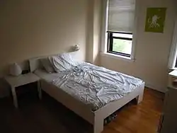 A microapartment, also known as a microflat, is a one-room, self-contained living space, usually purpose built, designed to accommodate a sitting space, sleeping space, bathroom and kitchenette with 14–32 square metres (150–350 sq ft).[1] Unlike a traditional studio flat, residents may also have access to a communal kitchen, communal bathroom/shower, patio and roof garden. The microapartments are often designed for futons, or with pull-down beds, folding desks and tables, and extra-small or hidden appliances. They differ from bedsits, the traditional British bed-sitting room, in that they are self-contained, with their own bathroom, toilet, and kitchenette.
