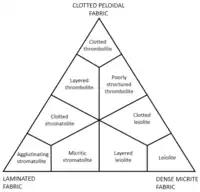 - Thrombolitic: microbialite with a clotted peloidal fabric if observed with a petrographic microscope. The density of peloids is variable. At the scale of the hand sample, the rock shows a dendritic fabric, and can be named thrombolite.
