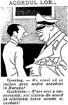 Anti-Nazi cartoon in Viața Românească, February 1934: Joseph Goebbels and Hermann Göring joking about the European alliances