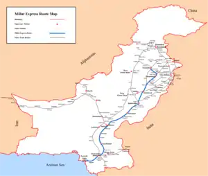 Millat Express (Urdu: ملت ایکسپریس) is a passenger train operated daily by Pakistan Railways between Karachi and Lalamusa.[1] The trip takes approximately 21 hours, 30 minutes to cover a published distance of 1,326 kilometres (824 mi), traveling along a stretch of the Karachi–Peshawar Railway Line, Khanewal–Wazirabad Branch Line and Shorkot–Lalamusa Branch Line.[2]