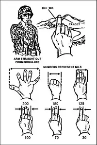 Angle can be used for either calculating target size or range if one of them is known. Where the range is known the angle will give the size, where the size is known then the range is given. When out in the field angle can be measured approximately by using calibrated optics or roughly using one's fingers and hands. With an outstretched arm one finger is approximately 30 mrad wide, a fist 150 mrad and a spread hand 300 mrad.