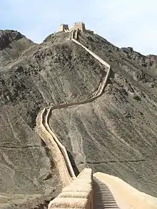 As offensive action against the nomads became increasingly untenable due to a shortage of fighting men and military supplies, Yu Zijun (余子俊; 14291489) first proposed constructing a wall in the Ordos region in August 1471, but this went against the traditional offensive-based policies in place since the early Ming. Minister of War Bai Gui (白圭) had tried to implement an offensive solution since taking office in 1467, and he objected to Yu's proposal because of cost fears.[16] On 20 December 1472, amid reports of people fleeing the frontier provinces due to the harsh military levies imposed to finance offensive campaigns, Yu reasoned that his wall project would not be as costly as the offensive strategy, and that the wall would be a temporary measure that would allow the Ming to restore its military and economic strength. The court and emperor approved the plan, and the 1473 victory in the Battle of Red Salt Lake (紅鹽池) by Wang Yue (王越) deterred Mongol invasions long enough for Yu Zijun to complete his wall project in 1474. This wall, a combined effort between Yu Zijun and Wang Yue, stretched from present day Hengcheng (橫城) in Lingwu (northwestern Ningxia province) to Huamachi town (花馬池鎮) in Yanchi County, and from there to Qingshuiying (清水營) in northeastern Shaanxi, a total of more than 2000 li (about 1,100 kilometres (680 mi)) long. Along its length were 800 strong points, sentry posts, beacon-fire towers, and assorted defences. 40,000 men were enlisted for this effort, which was completed in several months at a cost of over one million silver taels. This defence system proved its initial worth in 1482, when a large group of Mongol raiders were trapped within the double lines of fortifications and suffered a defeat by the Ming generals. This was seen as a vindication of Yu Zijun's strategy of wall-building by the people of the border areas.[17] By the mid-16th century, Yu's wall in the Ordos had seen expansion into an extensive defence system. It contained two defence lines: Yu's wall, called the "great border" (大邊, dàbiān), and a "secondary border" (二邊, èrbiān) built by Yang Yiqing (14541530) behind it.[18]
