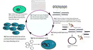 Once a suitable genomic fragment is chosen (Step 1), the exons and introns of the fragment can be inserted and amplified, along with the flanking constitutive exons and introns of the original gene, by PCR. The primers for PCR can be chosen so that they leave "sticky ends" at 3' sense and anti-sense strands (Step 2). These "sticky-ends" can be easily incorporated into a TOPO Vector by ligation into a commercially available source which has ligase already attached to it at the sight of incorporation[10] (Step 3). The subsequent TOPO Vectors can be transfected into E.coli cells (Step 4). After incubation, total RNA can be extracted from the bacterial colonies and analyzed using RT-PCR to quantify ratios of exon inclusion/exclusion (step 5). The minigene can be transfected into different cell types with various splicing factors to test trans-acting elements (Step 6). The expressed genes or the proteins they encode can be analyzed to evaluate splicing components and their effects via a variety of methods including hybridization or size-exclusion chromatography.[1][2]