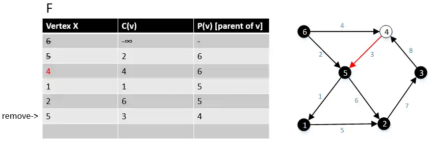 ![]() Next we move to the vertex 3 in the graph G, we found all the edge(3,w) ∈ E and their cost c(3,w), where w ∈ V. We find that the edge(3,4) > edge(6,4), so we remove the edge(3,4) and keep the edge(6,4). |