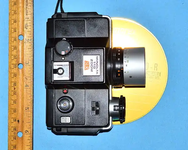 The Minolta 110 Zoom SLR is a 110 format single-lens reflex (SLR) camera produced by Minolta of Japan between 1976 and 1979. It was the first SLR in 110 format. It has an unusual, flattened shape. Other 110 SLRs were shaped like SLRs in larger formats, but the 110 Zoom SLR took the flat format of the typical 110 pocket camera and added a larger lens and prism hump to it. 1979's replacement, the Minolta 110 Zoom SLR Mark II, has a more conventional shape.