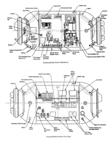 The Stykovochnyy Otsek (Russian: стыковочный отсек, English: Docking compartment), GRAU index 316GK, otherwise known as the Mir Docking Module or SO, was the sixth module of the Russian space station Mir, launched in November 1995 aboard the Space Shuttle Atlantis.[4] The module, built by RKK Energia, was designed to help simplify space shuttle dockings to Mir during the Shuttle-Mir programme, preventing the need for the periodic relocation of the Kristall module necessary for dockings prior to the compartment's arrival.[3] The module was also used to transport two new photovoltaic arrays to the station, as a mounting point for external experiments, and as a storage module when not in use for dockings.[1]