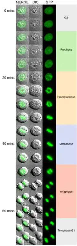 - 1 2 3 Cattin, Cedric J; Düggelin, Marcel; Martinez-Martin, David; Gerber, Christoph; Mueller, Daniel J; Stewart, Martin P (2015). "Mechanical control of mitotic progression in single animal cells". Proceedings of the National Academy of Sciences. 112 (36): 11258–11263. Bibcode:2015PNAS..11211258C. doi:10.1073/pnas.1502029112. PMC 4568679. PMID 26305930.