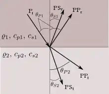 In seismology, a wave conversion specifically refers to the conversion between P and S waves at discontinuities.[4] Body waves are reflected and refracted when they hit a boundary layer within the earth. Here, P-waves can be converted into S-waves (PS-wave) at interfaces, as well as vice versa (SP-wave).[5] Here applies analogously for an incident P-wave: