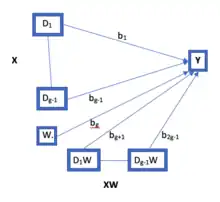 A statistical diagram that depicts a moderation model with W with three levels, as a multi-categorical independent variable.
