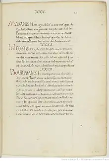 Manuscript of Jerome's De viris illustribus, the late 15th century, with a page showing entries for Musanus, Modestus and Bardaisan.
