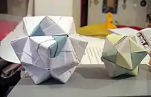 The Mukhopadhyay module can form any equilateral polyhedron. Each unit has a middle crease that forms an edge, and triangular wings that form adjacent stellated faces. For example, a cuboctahedral assembly has 24 units, since the cuboctahedron has 24 edges. Additionally, bipyramids are possible, by folding the central crease on each module outwards or convexly instead of inwards or concavely as for the icosahedron and other stellated polyhedra. The Mukhopadhyay module works best when glued together, especially for polyhedra having larger numbers of sides.