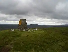 Moel y Cerrig Duon tops the eastern end of a long peat bog plateau along with Llechwedd Du. Its summit has a conical shape, rising suddenly from the bog. The summit itself is grassy, marked by a small cairn and a stake. To the north-east is Foel y Geifr, to the east Cyrniau Nod and to the west is Llechwedd Du, Esgeiriau Gwynion, and Aran Fawddwy.