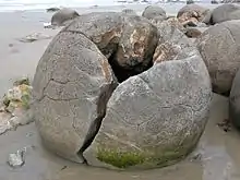 The Moeraki Boulders (officially Moeraki Boulders / Kaihinaki) are unusually large spherical boulders lying along a stretch of Koekohe Beach on the wave-cut Otago coast of New Zealand between Moeraki and Hampden. They occur scattered either as isolated or clusters of boulders within a stretch of beach where they have been protected in a scientific reserve. These boulders are grey-colored septarian concretions, which have been exhumed from the mudstone and bedrock enclosing them and concentrated on the beach by coastal erosion.[1][2][3][4] Especially in recent years, the boulders have been a popular tourist attraction.[3][5][6]