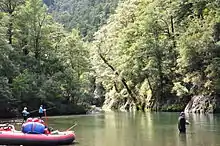 Up in the Kaweka range the Mohaka is a twisting grade II river with a bit of grade III. There are several Department of Conservation (DOC) campsites, hot pools and plenty of undisturbed native bush.[9] After approximately 36 km, it comes out of the Kawekas and farmland becomes more common[2] The river bends itself into an oxbow and shortly after rapids become larger as it leads into the grade III section. DOC campsites are still found along this 68 km stretch.[3]