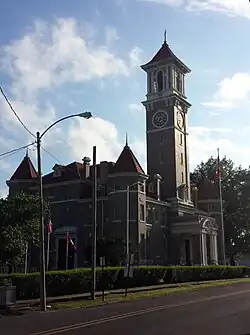 The Monroe County Courthouse is located at Courthouse Square in Clarendon, the county seat of Monroe County, Arkansas. It is a large brick building with Classical Revival features, designed by the architect Charles L. Thompson and built in 1911. It has low octagonal towers topped by tile roofs at each corner, and a tall clocktower on its main facade. The interior lobby spaces are finished with ceramic tile floors and marble wainscoting.[2]