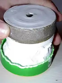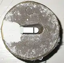 The moo box consists of a block and a bellows. The bellows is sealed to the bottom of the box and to the block. The block is heavy and perforated, and used to actuate the bellows, producing the sound.