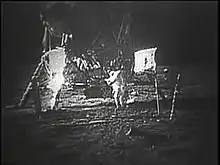 • Cameras on the Lunar Module did. The Apollo TV camera mounted in the Modularized Equipment Stowage Assembly (MESA) of the Apollo Lunar Module gave a view from the exterior. While still on the Module's ladder steps, Armstrong deployed the MESA from the side of the Lunar Module, unpacking, amongst other things, the TV camera. The TV camera was then powered on and a signal transmitted back to Earth. This meant that upwards of 600 million people on Earth could watch the live feed with only a very slight delay. Similar technology was also used on subsequent Apollo missions.[82][83][84][85] It was also filmed from an automatic 16mm movie camera mounted in a window of the Lunar Module.