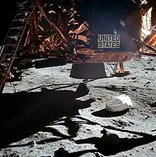 • On the surface of the Earth, Apollo 11's fueled and crewed Lunar Module, Eagle, would have weighed approximately 17 short tons (15,000 kg). On the surface of the Moon, however, after expending fuel and oxidizer on its descent from lunar orbit, the lander weighed about 1,200 kg (2,700 pounds).[110] The astronauts were much lighter than the lander, but their boots were much smaller than the lander's approximately 91 cm (3 ft) diameter footpads.[111] Pressure (or force per unit area) rather than mass determines the amount of regolith compression. In some photos, the footpads did press into the regolith, especially when they moved sideways at touchdown. (The bearing pressure under Apollo 11's footpads, with the lander being about 44 times the weight of an EVA-configured astronaut, would have been of similar magnitude to the bearing pressure exerted by the astronauts' boots.)[112]