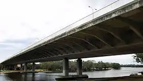 Designed by Maunsell & Partners and built by Thiess Contractors,[3] construction of the bridge started in 1986. The bridge was constructed using an incremental launch technique, and cost A$15 million to complete.[4] It was officially opened on 16 April 1988.[5] The bridge is 271 metres (889 ft) long, with five spans and a pre-stressed concrete deck 34 metres (112 ft) wide, supporting six lanes of traffic.[3] The structure of the bridge is that of a hollow box girder,[3] with the outer sides of the deck supported by special Y-beams.[6] A shared-use path was opened underneath the bridge in March 2023.[7]