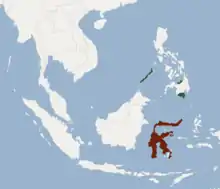 It is native to Southeast Asia where it is found in Indonesia and the Philippines. It has been found at elevations up to 1,000 m (3,300 ft) above sea level.[1]