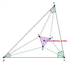 Let DEF be the Morley triangle of ABC. The centroid of DEF is called the first Morley center of ABC.[1][3]