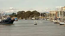 The location was initially named "Moss", after Charles Moss.[6] The Moss post office opened in 1895 and in 1917 changed its name to "Moss Landing".[6][12] It became a busy whaling and fishing port and a location for fish processing plants and canneries. The Moss Landing Harbor District, established in the 1940s, dredged channels and built piers. The Moss Landing Power Plant opened in 1950. The California State University system founded Moss Landing Marine Laboratories in 1966 (it was rebuilt nearby after the Loma Prieta Earthquake destroyed the facility in 1989), and in the mid-1990s the Monterey Bay Aquarium Research Institute was moved to Moss Landing from Pacific Grove. In the 1980s, then-Monterey County Supervisor Marc Del Piero secured millions of dollars in federal grants to cure historic and chronic water pollution issues and sanitary sewers were installed.[12]
