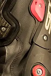 Boots are worn by motorcycle riders and passengers to prevent or reduce harm to their feet and ankles while riding and in the event of a crash. They are designed using materials and seam construction that are impact, abrasion, cut, tear and burst resistant. Tough, strong, moderately flexible boots with stiff soles provide the rider protection from a number of risks. Boots with oil-resistant, rubber-based composite soles give a grip on the pavement and help keep the rider's feet on the pegs. Boots may also have energy absorbers and load spreaders on the shin, inside and outside of each ankle. A stiff sole working laterally helps prevent or decrease crash injuries caused by crushing and shear strain.